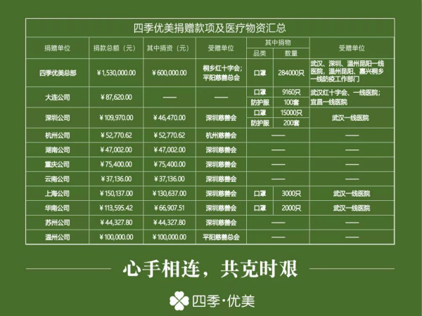 截至25日,四季優美(含公司捐贈、創始人個人捐贈及全國各分公司捐贈)累計為抗疫定向捐贈物資口罩313,160只、防護服300套,資金捐贈1,200,650.93元,合計金額2,347,958.84元。