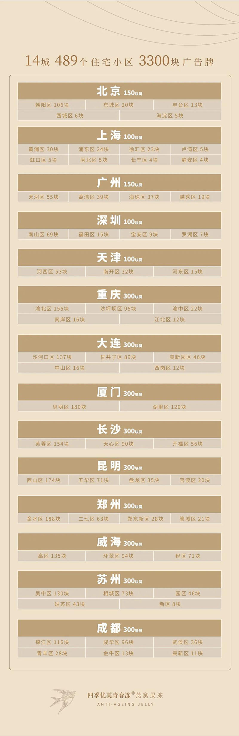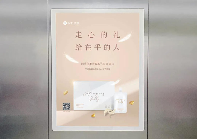 四季優美緊扣節日契機,下好“先手棋”,以“節禮”為主題的梯媒廣告迅速在北京、上海、廣州、深圳、天津、重慶、大連、廈門、長沙、昆明、鄭州、威海、蘇州、成都這十四座城市上線。作為高頻鏈接終端視野的傳播方式,梯媒廣告日益成為各大品牌的戰略選擇,此次四季優美青春凍單品的梯媒廣告覆蓋面多達489個住宅小區,共計3300塊廣告牌。高覆蓋量與精致畫面的優勢疊加,將實現品牌的進一步曝光與傳播,持續深化品牌形象,助推四季優美青春凍燕窩果凍進入更縱深的終端市場,不斷增強用戶粘性。