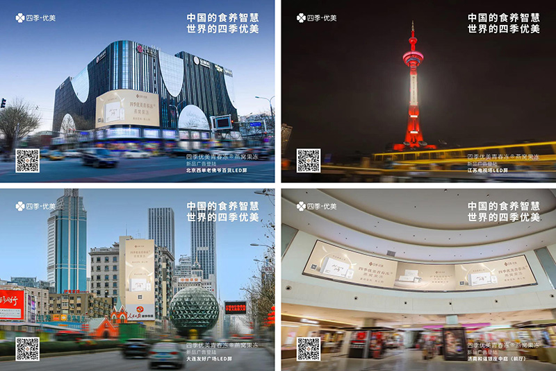 消費市場的競爭日趨激烈,作為新品的四季優美青春凍®燕窩果凍要實現真正的出圈,除了在品質上做足文章,也需要多渠道提升品牌賦能。此前為四季優美青春凍®燕窩果凍量身定制的深圳、廣州、昆明、鄭州、廈門、北京、天津、哈爾濱、大連、沈陽、南京、蘇州、杭州、溫州、長沙、上海、重慶、成都、青島、濟南這二十城商場+戶外大屏廣告,以唯美畫面直抵消費者的視野,“真材足料·用心制”這句slogan與千萬級流量碰撞產生的勢能,在第一時間引爆了新品第一波銷售熱潮,為開拓終端市場帶去了實實在在的利好。