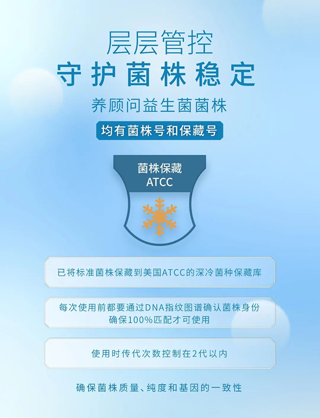 養顧問所選菌株全部保藏于世界上最大的生物資源中心——美國ATCC的深冷菌種保藏庫,傳代次數嚴格控制在2代以內,以確保菌株的質量、純度和基因的一致性,并且全部有菌種名、菌株號、保藏號,可實現全程追溯。