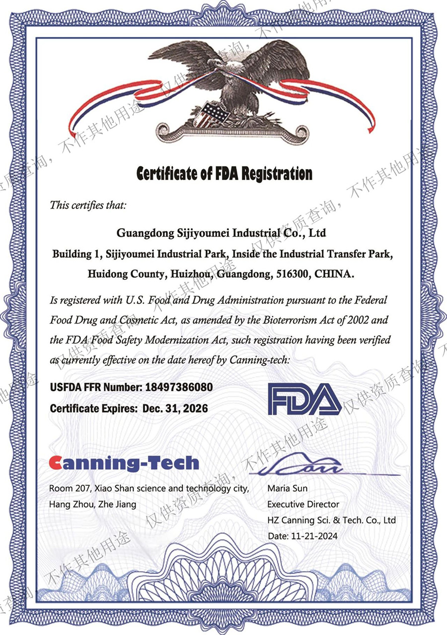 近日,廣東四季優美實業有限公司(以下簡稱“四季優美”)已順利完成在美國食品藥品管理局(FDA)的注冊更新程序,注冊號:18497386080。此次注冊更新,涵蓋了公司目前在售的所有產品類別,包括固體飲料、咖啡、水果及其制品、果凍等,標志著四季優美在國際市場的品質管理和食品安全標準上又邁出了堅實一步。